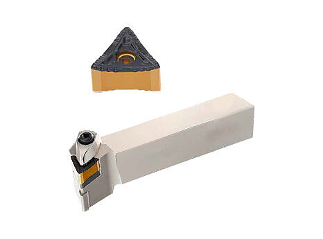 Neue 2-seitige, 4-schneidige Wendeschneidplatten und Halter für Drehbearbeitungen in alle Richtungen einschließlich Rückwärtsdrehen mit hohem Vorschub.